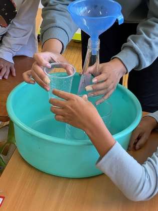 同じ大きさのコップを使って水を入れることによって、コップで何杯入るか調べました。