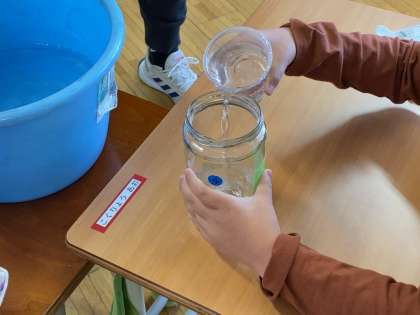 どちらのビンが多く入るか予想した後、実際に水を入れて比べてみました。