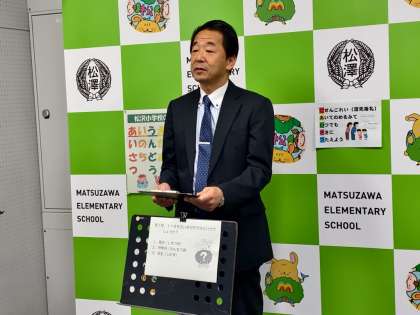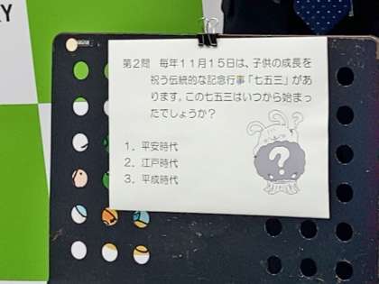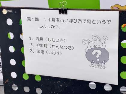 「季節の出来事に興味をもち、季節を感じられる子になってほしい」という校長先生の願いから、月の異名について、七五三について、23日の勤労感謝の日について、学校の創立記念日について等、計6問のクイズを出してくださいました。