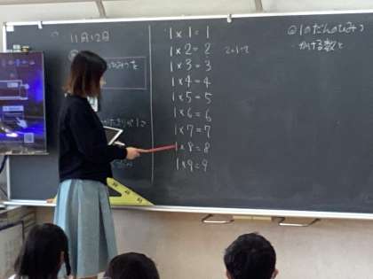 11/12 1の段の秘密 2年生 公開日 2022/11/12 更新日 2022/11/12 できごと 算数のかけ算の学習です。 他の段を学習したときの九九表の見方・考え方を生かして、1の段の九九表から考えられる「1の段の秘密」を探しました。 「かける数と答えが同じになっている」と九九表を見て分かったことだけでなく、「読むときに必ず、『が』がつく」と1の段を唱えるときの秘密についても気が付いていました。 いいね(0)