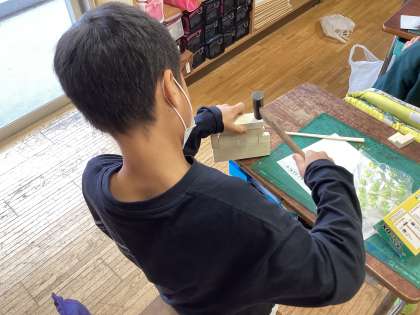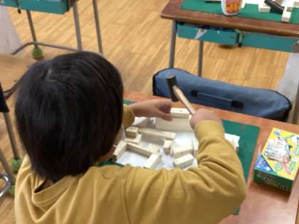 かなづちと釘を使って、木材と木材をつなげていきます。何ができるかは、子供一人一人の想像力にかかっています。手元に集中して安全に気を付けながら、釘を打っています。