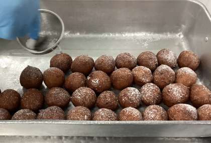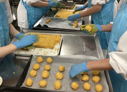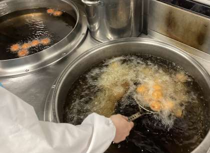 北海道中川町のかぼちゃは甘いので、砂糖が控えめでもおいしいデザートができます。小麦・卵・乳を使わない米粉パンプキンドーナツは、これらの食物アレルギーをもつ児童でも食べられます。中川町のみなさん、おいしいかぼちゃをありがとうございました。