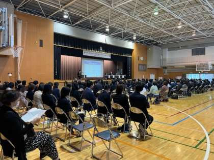 授業後には体育館で研究発表を行い、松沢小の取組について説明しました。