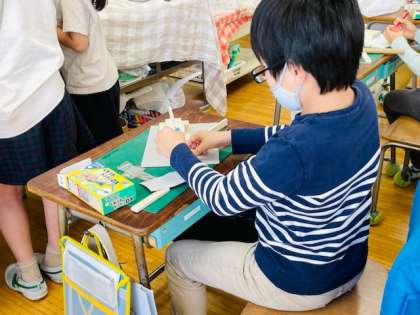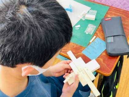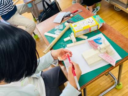 図工では、木と釘を使って想像した生き物や建物を作っています。