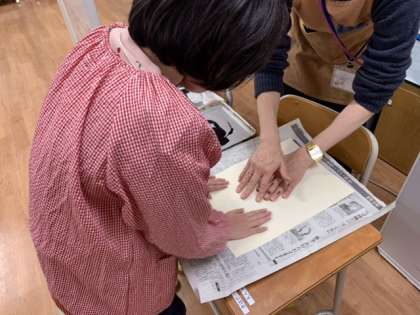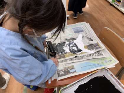 その後、紙版画にインクを付けたローラーをコロコロと動かして、和紙に写しました。