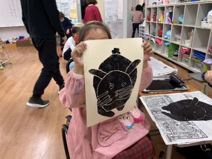来年の干支「うさぎ」の形を作り、それを切って貼り紙版画を作りました。