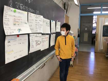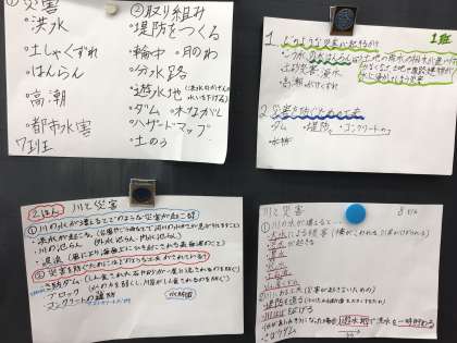 川の水が増えるとどのような災害が起こるのか、災害を防ぐために、川にはどのような工夫がされているのかについてグループで調べ、発表しました。