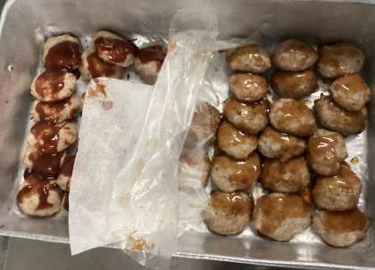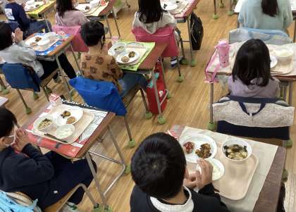 2学期最後の給食は、ケチャップソースと照り焼きソースのどちらかを選ぶハンバーグです。今日は冬至でもあるので、南瓜のいとこ煮が付け合わせです。すまし汁はほんのりと柚子が香ります。