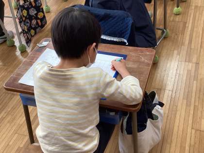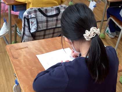 字を丁寧に書くためにはまずは姿勢から。両足をしっかり地面につけて、背筋を伸ばした状態で鉛筆を握り書きます。お手本を見ながら、1文字1文字丁寧に書いていました。