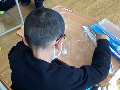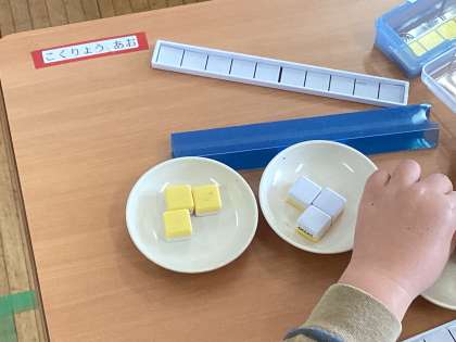 算数ブロックをお皿やコップに実際に分けながら考えていました。