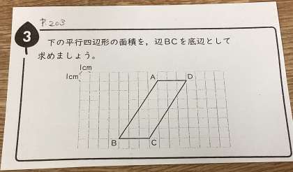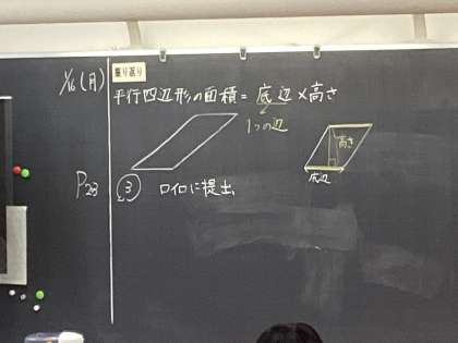 1/16 平行四辺形の面積の求め方 5年生 公開日 2023/01/16 更新日 2023/01/16 できごと 高さが図形の外にある平行四辺形の面積の求め方を考えました。 まずは自力解決。今まで学習したことを振り返りながら、解き方を考えます。 次に考えをロイロノートを使って共有します。友達が考えた解き方で納得できる考えを見付け、理解を深めていました。 いいね(0)