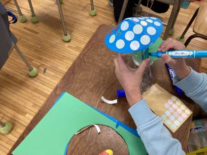 「きのこと森の家」というテーマで工作をしました。自分が持ってきたペットボトルに色画用紙の屋根を付け、オリジナルの家を作りました。もう一つは紙コップに違う色の色画用紙の屋根を付けて、オリジナルのキャラクターを作りました。紙を貼ったり、ペンで絵を描いたりして、思い思いの家やキャラクターが出来上がりました。