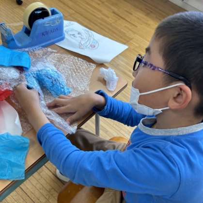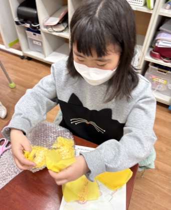 図工では、緩衝材と花紙を使って、雪だるまを作っています。