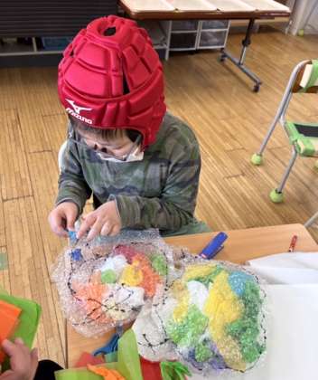 2/9 図工「プチプチ雪だるま」 きはだ学級