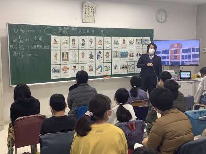 英語でヒントを出しながら、特定の人物をあてるゲームをしていました。