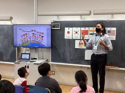 「HELLo!」「ニイハオ!」「こんにちは!」モニタに映る世界の地図を見て、みんなで発音しながら様々な国の挨拶を学びました。