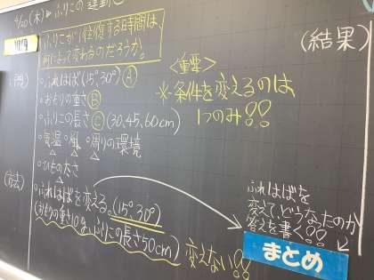 ふりこが往復する時間が何によって変わるか実験を行っていました。
