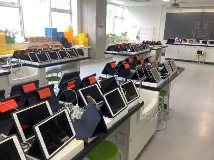 ICT支援員が一生懸命作業をしていますが、140台を超えるタブレットの初期化作業はを並べると大変です。