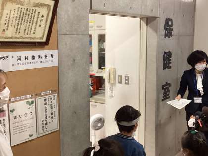 今日探検するのは「北校舎」。早速、北校舎1階にある「保健室」の説明をみんなで見て回っていました。