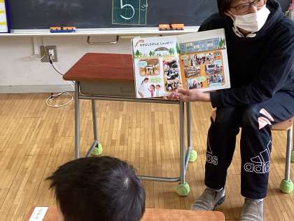 生活科の学校探検。2年生が1年生に校舎にある教室の説明をしながら、学校を探検します。