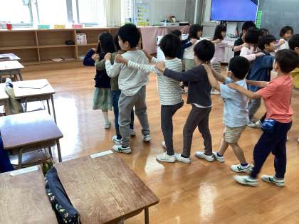 スローテンポの音の時はゆっくり歩き、アップテンポの音の時は速めの駆け足。音をしっかり聴き分けながら行いました。大盛り上がりで2回戦。楽しんで活動できました。