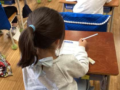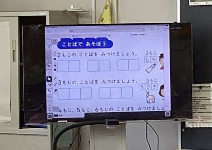 まずは、2文字の言葉、3文字の言葉から探します。食べ物、生き物、色、教科など、知っている言葉を見つけ、教科書に書き込んでいました。