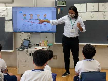 挨拶について学びました。good、fine、happy、hungry・・・などについて発音したり、モニターを観てクイズに答えたり、二人組で挨拶の練習をしたりしました。