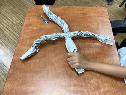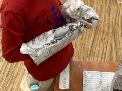 お面や服、ボクシングのグローブ、ソード、帽子などなど子供たちの自由な発想のもと制作し、制作後には体に身に付けたり、持って動かしたりして、楽しむ姿が見られました。