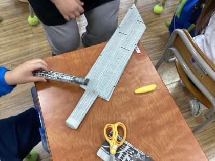 新聞紙を切って、ちぎって、貼り付けて、いろいろなものを作成しました。