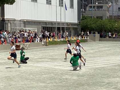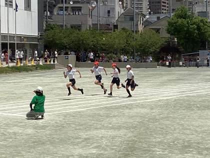 5・6年生による短距離走。今までの経験や体育の学習を生かして、力強く走れる子が増えてきました。ゴールに到着したときの清々しい顔も印象的でした。