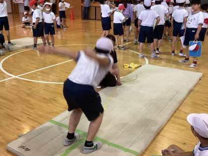 今日は2年生と5年生の子供たちが、体育館で3つの種目(立ち幅跳び、反復横跳び、長座体前屈)の3種類の種目に取り組みました。