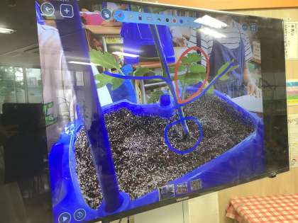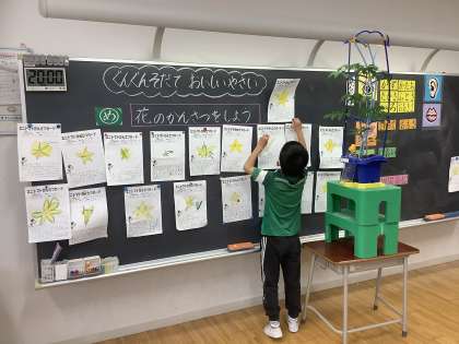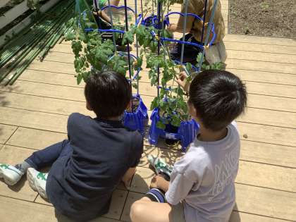 苗の観察をしてからあっという間に背丈を伸ばし、花を咲かせたミニトマト。花の観察をしてから、さらに成長するよう『わき芽つみ』をしました。