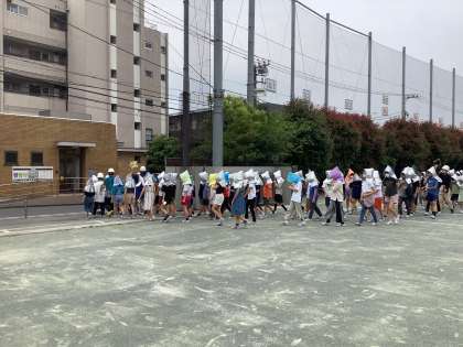 今日は、地震のあと、給食室から出火をし、さらに火災がひどくなる可能性を考え第2校庭まで避難をする訓練を行いました。
