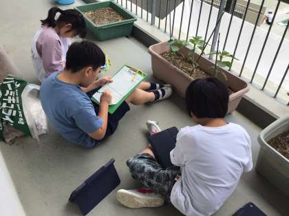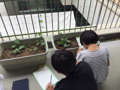 観察の時に改めて細かい部分まで見てみると、「ヒマワリの茎は、下はツルツルだけど、上の方はチクチクしている。」「ヘチマのつるがネットにつかまっている。」など新しい発見がたくさんありました。