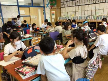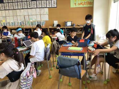 震災後の復旧を進める政治の働きについて学習問題を考え、グループで調べ学習に取り組んでいます。