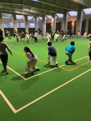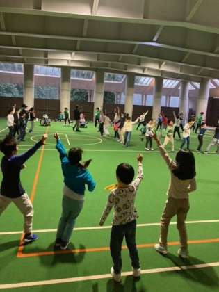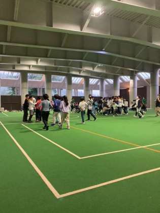 雨が降ったりやんだりと不安定なので、屋根付き広場でやることにしました。ゲーム、歌、ダンスとノリノリです。特にダンスが大好きな子供達です。
