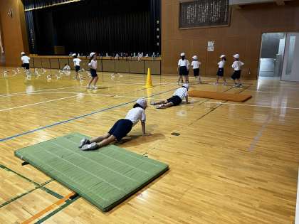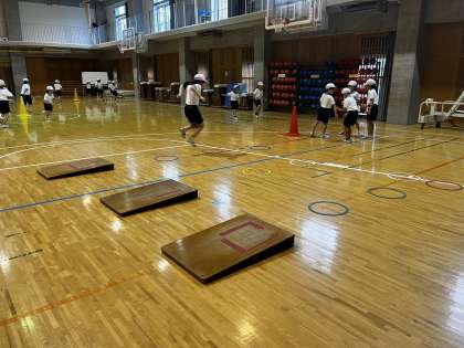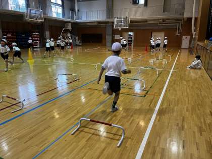 4つのコースを作り、走の運動、跳の運動コースを楽しみました。サーキットゲームを取り入れ、じゃんけんで勝った場合のみ次のコースへ進む!負けた場合はひたすら中央のコーンまで走り、タッチして再挑戦!汗びっしょりの子供たちから『またやりた』!この言葉にこちらもにっこりです。