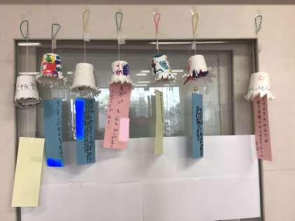 紙コップを使って風鈴を作りました。紙コップにペンで絵を描いた後、糸を通し、鈴をつけました。短冊に願い事を書いて糊づけして完成です。風が吹くと爽やかな音が鳴りました。