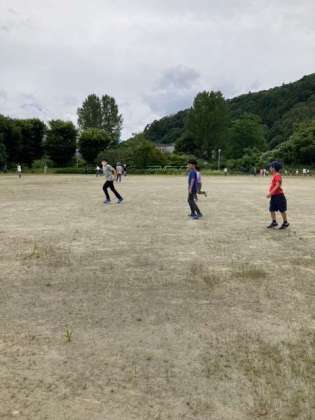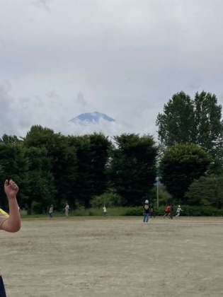 お弁当のあと、園庭で鬼ごっこ。さっきまで雲で隠れていた富士山が少し見えました。