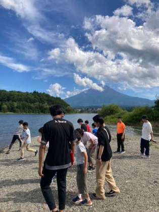 学園のそばの湖畔です。だれが一番、石を水の上でバウンドさせられるか競争です。