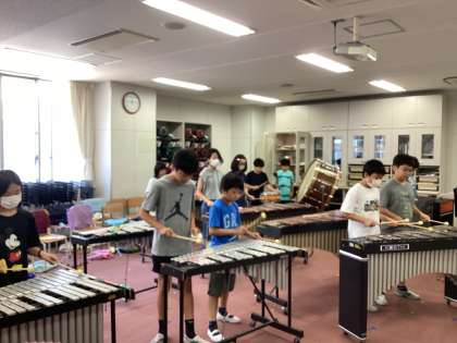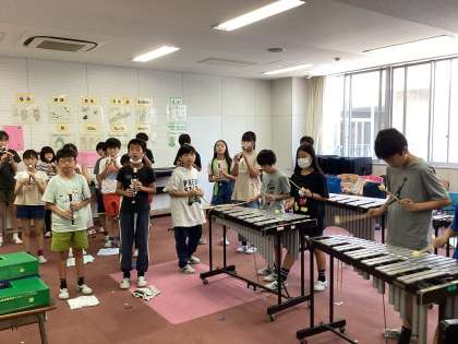 どの楽器を重ねると充実した響きになるか、4種類のパターンを考えてみんなで合奏をしながら音で確かめました。「打楽器とピアノは全体を支えているからいつもあって欲しい。」など音をよく聴いてバランスを考えて合奏しました。