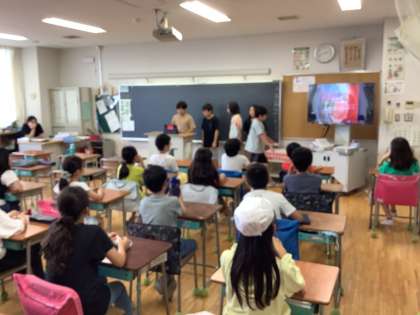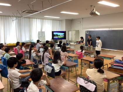 6月に川場村に行って体験したこと、事前学習で調べたことを4年生に向けて発表しました。