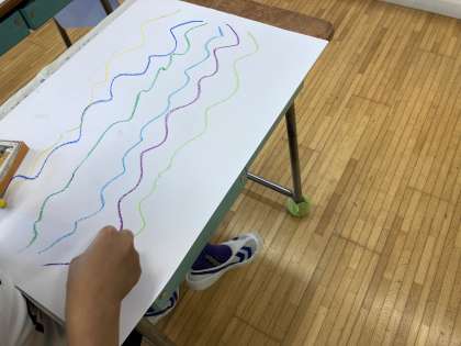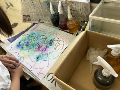 「りょうてでぐるぐる」では、クレパスを両手に一本ずつ持ち、上から下へ向かって同時に模様を描き始めます。何度か色を変えてオリジナルの模様を作りました。その後、色つきの4色のスプレーを4回くらいずつ噴射して楽しみました。