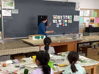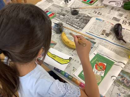 葉書に描く本番では、筆を使って輪郭を描き、顔彩で色を塗っていきました。同じ物を描いていても、描く角度や筆や顔彩の使い方によって、絵の雰囲気が大きく変わります。