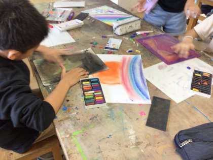 クレパスのぼかし技法を使い、心に浮かんだものを描いています。