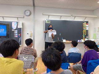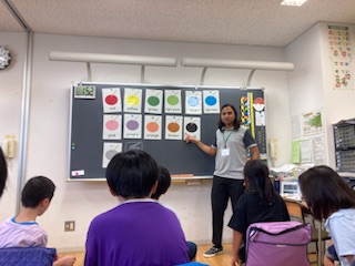 それから、赤、青、黄色、緑などのカラーについて発音してから「I like red.」「I like blue.」と自分が好きな色を選んで、伝え合う活動をしました。