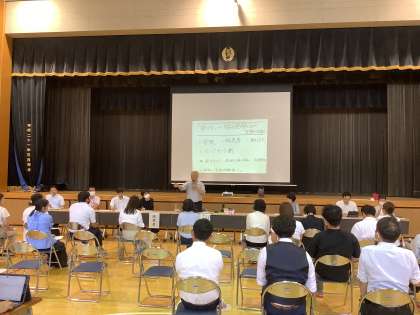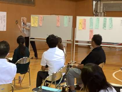 授業後は、日本国語教育学会常任理事の井出一雄先生よりご指導、ご好評をいただきました。物語文はお話の大体を捉えることを目指すこと、演じるうえでは完璧にさせようと指導者が型にはめ込むのではなく試させてみること、特別支援教育などの少人数の指導では個々の理解度の差が大きい場合もあるので、個別の指導も状況に応じて行っていくことなどをご指導いただきました。
