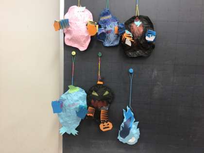 図工で「びょんびょんおばけ」を作りました。画用紙をしわしわにし、形をハサミで切って、ステープラで周りを止めました。その後、ティッシュを詰めて膨らませ、画用紙で腕を付けたり、顔を描いたりしました。最後に輪ゴムを三本繋げて取り付けたら完成です。思い思いのお化けが完成しました。