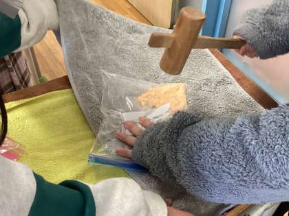 入浴剤を砕くのには力がいります。木槌を使って何度も叩きました。