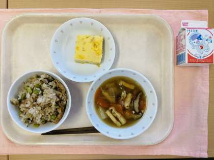 今日のごはんは、小豆と枝豆の2種類の豆を入れた